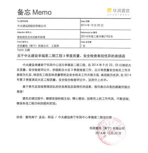近日,華潤置地(南寧)有限公司發來表揚函,以表揚集團公司在幸福里二期工程三季度質量、安全檢查中的優異表現。