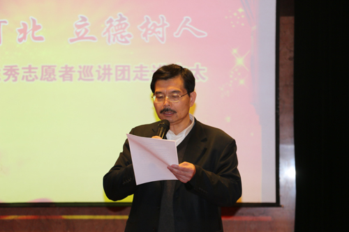 11月18日上午,由河北省文明委、共青團(tuán)省委、省教育廳、省志愿服務(wù)聯(lián)合會、省志愿服務(wù)學(xué)院等部門聯(lián)合開展的“善行河北、立德樹人——優(yōu)秀志愿者巡講(2015)活動”, 來到中太進(jìn)行巡講。受集團(tuán)黨委書記、董事局主席李文健同志委托,集團(tuán)黨委副書記、企業(yè)文化中心總監(jiān)鐘崇鶴同志代表集團(tuán)黨委講話致辭,向省優(yōu)秀志愿者巡講活動團(tuán)成員和市委文明辦的各位領(lǐng)導(dǎo)蒞臨中太,表示熱烈的歡迎!并畫龍點睛地闡明了巡講活動的重要意義和明確了下一步學(xué)習(xí)的方向和工作任務(wù)。