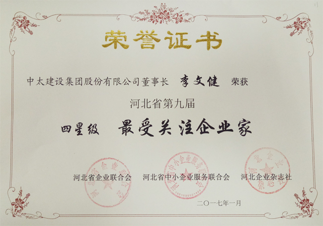 近日,河北省企業(yè)聯(lián)合會(huì)第六屆會(huì)員代表大會(huì)暨2017年河北省企業(yè)管理創(chuàng)新大會(huì)在石家莊召開,會(huì)議通報(bào)《河北省第九屆“最具影響力”“最具成長性”“最受關(guān)注企業(yè)家”評(píng)審結(jié)果》。中太建設(shè)集團(tuán)獲評(píng)四星級(jí)“最具影響力和最具成長性企業(yè)”(“雙最”企業(yè)),李文健主席被授予“最受關(guān)注企業(yè)家”稱號(hào)。