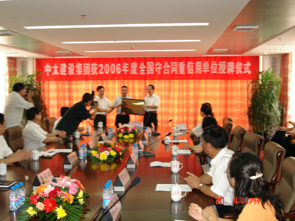 中太建設集團獲2006年度全國守合同重信用單位授牌儀式于2007年8月20日在中太大廈十六樓會議室舉行。河北省工商行政管理局受國家工商行政管理總局的委托,向中太建設集團授予獎牌。