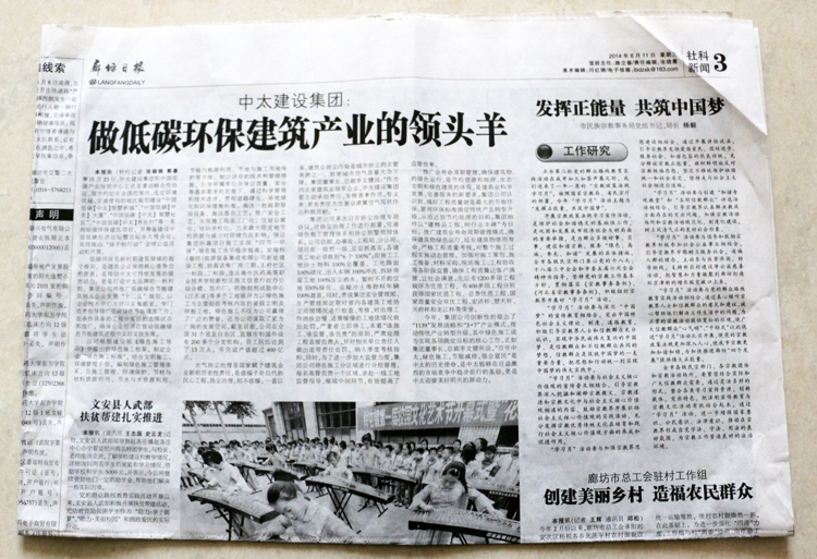 廊坊日?qǐng)?bào)三版頭條報(bào)道了中太建設(shè)集團(tuán)做低碳環(huán)保建筑產(chǎn)業(yè)的領(lǐng)頭羊