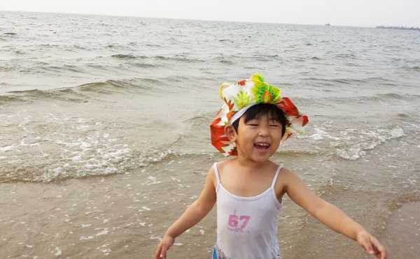 拍了照片后,突然讓我感覺(jué)像文清同學(xué)媽媽去澳門時(shí)住在海景房拍的海景照片! 看完海景就開始了匆忙的換泳衣準(zhǔn)備下海,海景公寓的好處就是出來(lái)小區(qū)走上自己的棧道就是小區(qū)的私家海灘,非常干凈。近距離的接觸大海,吹著涼爽的風(fēng)(天氣多云,溫度在29度),讓我們一行幾個(gè)馬上開懷起來(lái),每個(gè)人的興奮在臉上流露。孩子是最興奮的,跑到海邊上,任憑海浪一層層的打過(guò)來(lái)(這天風(fēng)并不大),孩子說(shuō):“媽媽,你看大海碰我了!”竟然用起了擬人句,把大海打過(guò)來(lái)的浪花比作在“碰”,這字用的多么美妙啊!我一邊欣賞著美景一遍在咂摸著這話,贊嘆著孩子的天真和用詞之妙。我們真的跳入大海浸泡的時(shí)候,舅舅在照顧著她,突然一個(gè)浪打在了孩子的頭上,孩子嚷著:“我要離開大海了”,這是在身邊的舅舅轉(zhuǎn)告我的,我在想孩子真是長(zhǎng)大了,會(huì)表達(dá)很多個(gè)人的感情了,“啊,我要離開大海了”是一個(gè)陳述句,但是好像是表達(dá)著一種不舍得離開但是有不得已的感情,她很想在大海里再待一會(huì),但是因?yàn)樗焕嘶ù驖窳祟^發(fā),依她個(gè)人的膽量可能害怕了,所以說(shuō)了句“啊,我要離開大海了”,孩子的成長(zhǎng)讓我們自覺(jué)不自覺(jué)真切感受到了。然后她自己在海灘玩沙子,挖了大大的沙坑,每當(dāng)海浪沖過(guò)來(lái)的時(shí)候,總是興奮的說(shuō):“媽媽大海幫我大忙了,還給其他家人也興奮的嚷嚷,大海可是幫了大忙了”。當(dāng)我問(wèn)她到底幫了什么忙時(shí),她說(shuō):“大海給我的沙坑送來(lái)了水啊”(估計(jì)是她不用拿著自己的小碗去海邊舀水了)。我感嘆著女兒的天真浪漫和快樂(lè)興奮,內(nèi)心在想:帶著孩子出來(lái)玩玩是多么對(duì)的選擇,大自然的風(fēng)光的確是能刺激人的靈感,說(shuō)了那么多令我平時(shí)聽不到的妙字妙語(yǔ)。這趟短途旅行意義非凡!